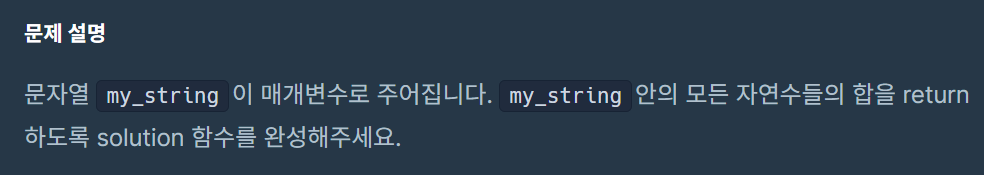 class Solution { public int solution(String my_string) { int sum = 0; String str = my_string.replaceAll("[^0-9]",""); for(int i=0; i<str.length(); i++){ sum += Integer.parseInt(String.valueOf(str.charAt(i))); } return sum; } }