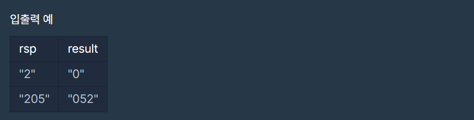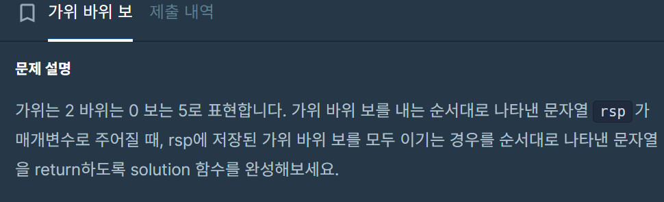 방1) function solution(rsp) { var answer = ''; for(let i=0; i<rsp.length; i++){ let ch = rsp.charAt(i) if(ch == '2') answer += '0' else if(ch == '0') answer += '5' else if(ch == '5') answer += '2' } return answer; }