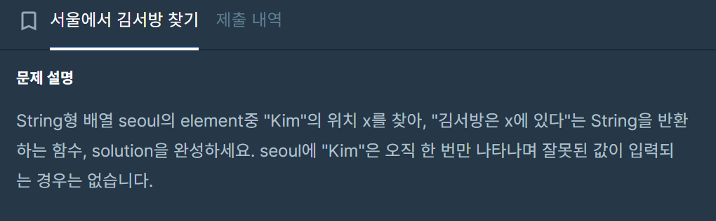 function solution(seoul) { return '김서방은 ' + seoul.indexOf('Kim') +'에 있다'; }