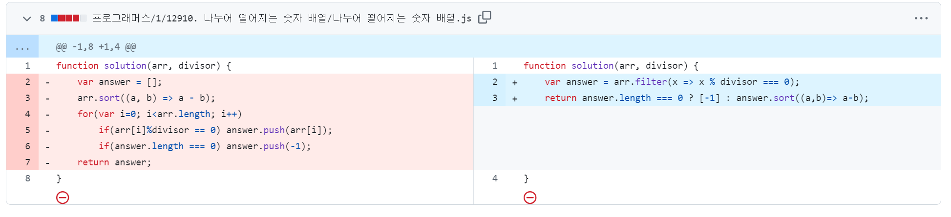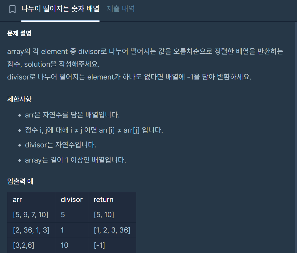 1. filter()를 이용해 나누어 떨어지는 수만 걸러낸다. 2. 삼항 연산자를 이용해 나누어 떨어지는 수가 없으면 -1을 배열로 반환하고 그렇지 않으면 filter로 걸러낸 수를 오름차순으로 정렬한 후 배열로 반환시키낟.