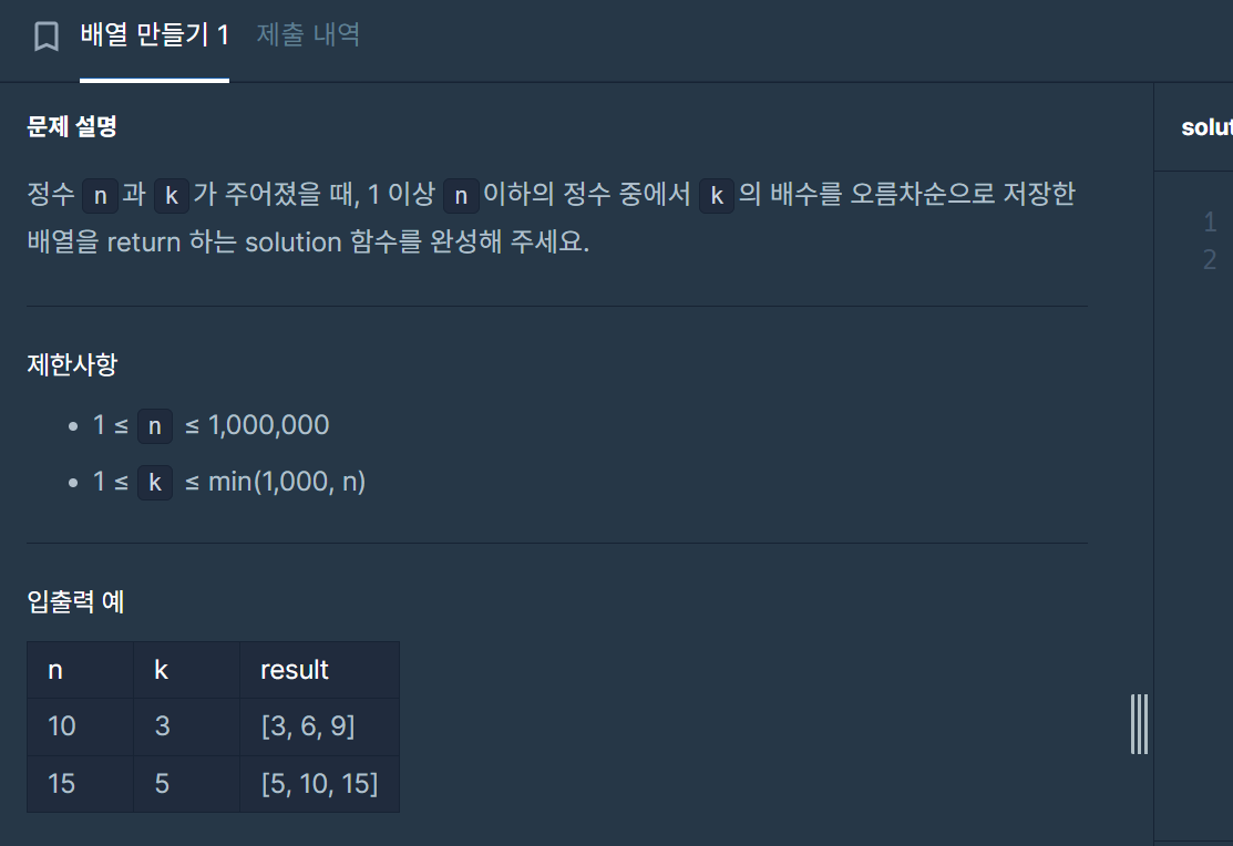 def solution(n, k): answer = [] // 배열 준비 for i in range(1, n+1): // 1부터 n이하까지의 숫자를 i 지정 if i % k == 0: // i를 k의 배수일때 answer.append(i) // 그 숫자들만(i) answer 배열에 넣어준다. return answer