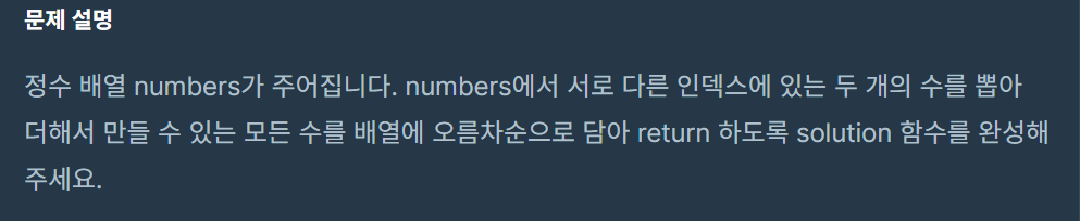 1. 이중 for문을 돌려 요소의 처음 위치와 요소의 다음 위치들의 합을 모두 구해 answer 배열에 넣어준다. 2. 중복된 수를 제거한다. 3. 오름차순으로 정렬해 배열에 담는다. 여기서 제일 중요한 작업은 중복된 수를 제거하는 것이라고 생각하고 이 과정에서 좀 애를 먹었기도 했다. 중복된 수를 제거하는 방법에는 2가지가 있는데 이번에는 이 두 가지에 대해서 알아 보려고 한다!