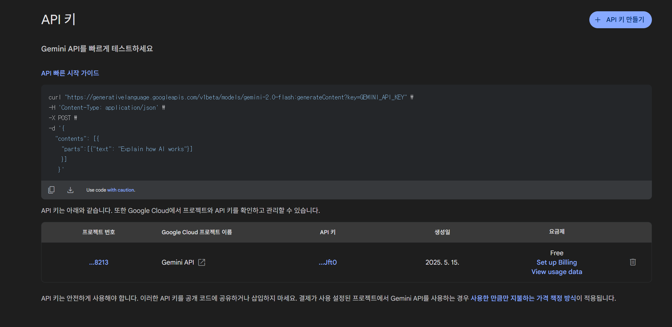 이렇게 나오면 API 키를 발급 받는데 성공했다는 것을 볼 수 있다~