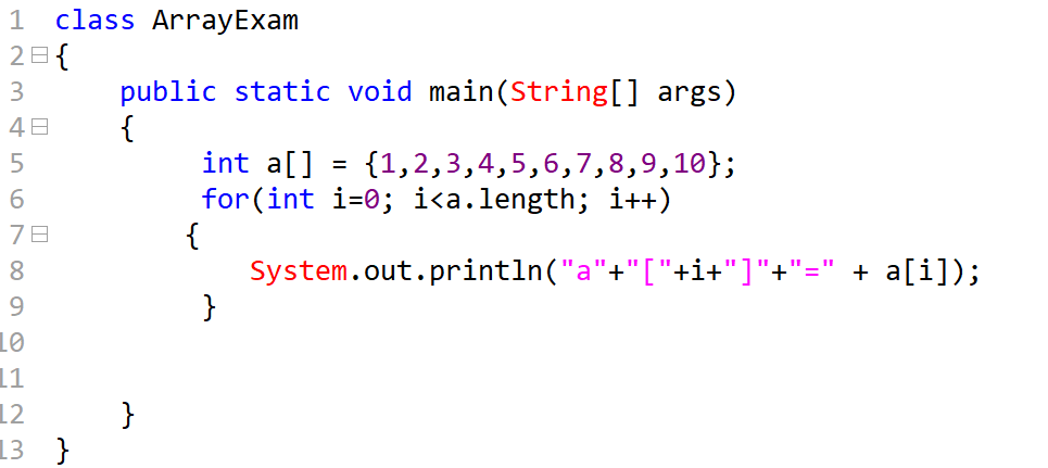 그럼, for문을 통해 a배열을 인덱스 0~ length-1까지 순화하면서 각 원소를 출력시켜보겠습니다.