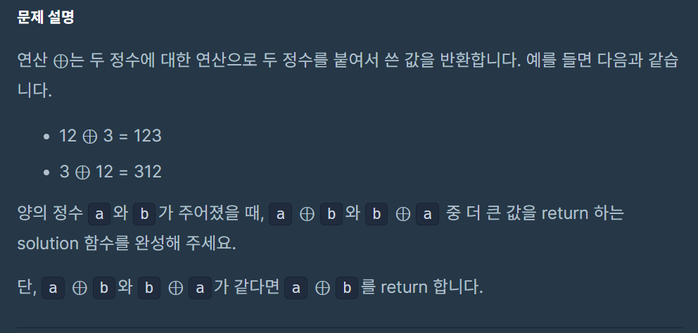 class Solution { public int solution(int a, int b) { //1. 문자로 계산하기 //2. 문자로 계산한 값을 정수로 바꾸기 //3. 정수로 바꾼 값들을 서로 비교해서 큰 값을 return 하기 String num1 = String.valueOf(a) +String.valueOf(b); String num2 = String.valueOf(b) +String.valueOf(a); int num3 = Integer.parseInt(num1); int num4 = Integer.parseInt(num2); if(num3>=num4){ //더 큰 수를 반환하기 return num3; } else{ return num4; } } }
