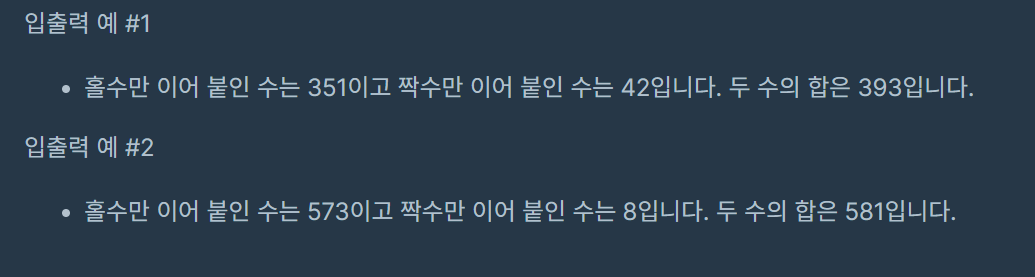 String sum1 =""; //짝수를 누적 String sum2 =""; //홀수를 누적 for(int i=0; i<num_list.length; i++){ if(num_list[i]%2==0){ //인덱스 값이 짝수이면 sum1 +=String.valueOf(num_list[i]); //각 인덱스들의 값을 문자열로 바꾸고, sum1에 누적 } else{ //인덱스 값이 홀수이면 sum2 +=String.valueOf(num_list[i]); //홀수 인덱스 값을 문자열로 바꾸고, sum2에 누적 } }