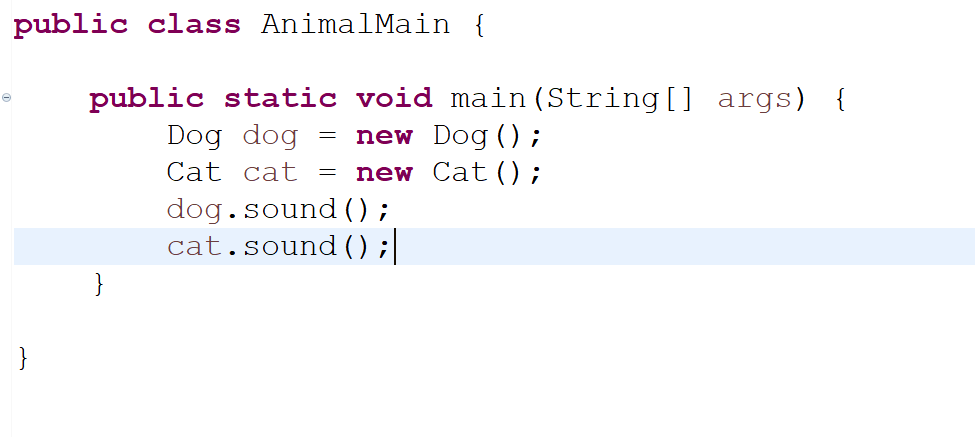 그 후 Dog, Cat 객체를 만들고 sound() 메소드를 호출 시켜주면 각각 "멍멍"과 "야옹"이 출력되는 것을 볼 수 있다.