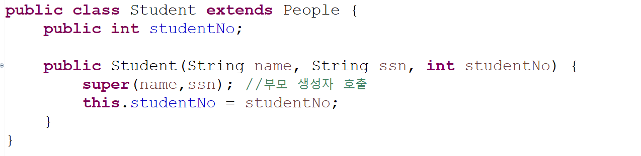 - 자식 생성자에서 반드시 부모 생성자 호출을 위해 super()을 명시적으로 호출해야 된다.