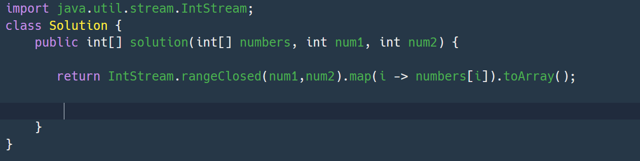 IntStream.rangeClosted로 num1부터 <=num2까지의 길이를 정한다. .map() 메소드를 통해서 numbers[i] 를 구해준 후 .toArray()를 통해 numbers[i]의 값을 배열로 만들어준다.