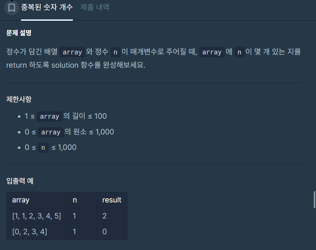 import java.util.Arrays; class Solution { public int solution(int[] array, int n) { return (int)Arrays.stream(array).filter(i -> i==n).count(); } }
