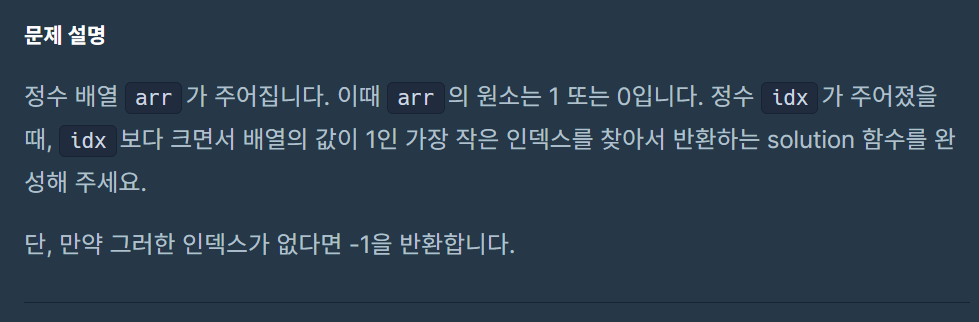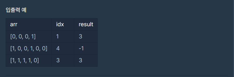 특히 idx 보다 크면서 배열의 값이 1인 가장 작은 인덱스를 반환하라는 말이 잘 이해가 되지 않았다. 주어진 idx가 arr[i]의 인덱스라고 설명 해주었으면 하는 바램인데 그냥 정수라고 idx라고만 주어져 있어서 모처럼 아쉬운 문제였다..ㅠㅠ
