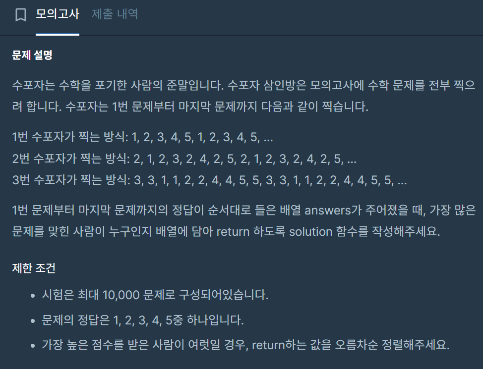 function solution(answers) { let answer = []; let cnt = [0,0,0]; let first = [1,2,3,4,5]; let second = [2,1,2,3,2,4,2,5]; let third = [3,3,1,1,2,2,4,4,5,5]; for(let i=0; i<answers.length; i++){ if(answers[i] === first[i % first.length]) cnt[0]++ if(answers[i] === second[i] % second.length) cnt[1]++ if(answers[i] === third[i] % third.length) cnt[2]++ } let max = Math.max(...cnt); //5, 2 for(let i=0; i<cnt.length; i++){ //cnt [5,0,0], [2,2,2] if(cnt[i] === max) answer.push(i+1) } return answer; }